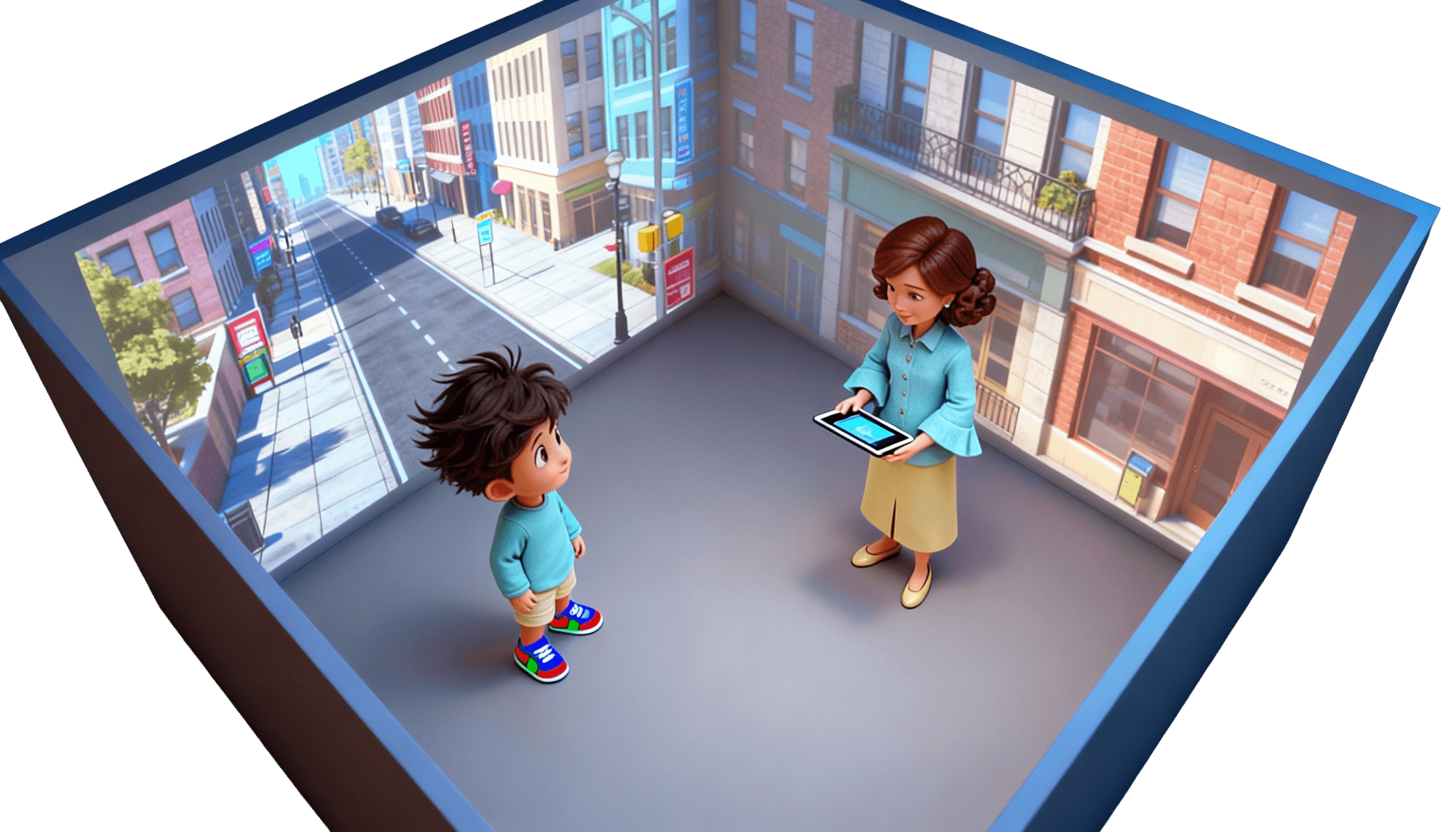 Our immersive room version surrounds the learner with interactive projections on three walls, bringing real-world situations into a safe, calming, and controlled learning space.